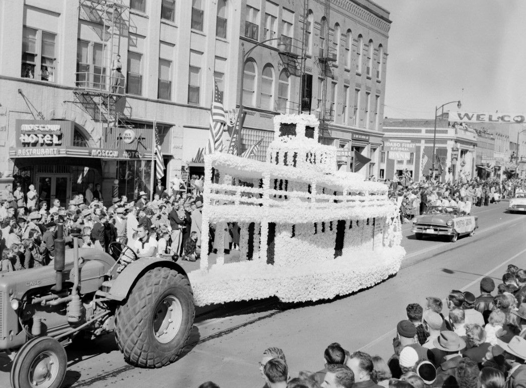 A parade float going down Main Street in front of the Moscow Hotel. The float is in the shape of a boat and is being pulled by a tractor.