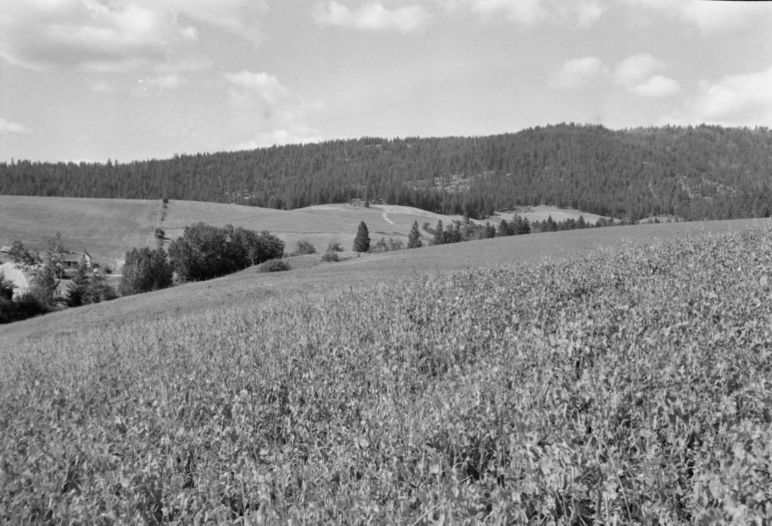 Looking across a field of peas, a draw in the middle distance has trees, house and barns, another field beyond that, with a ridge of trees in the background (similar to 1231)