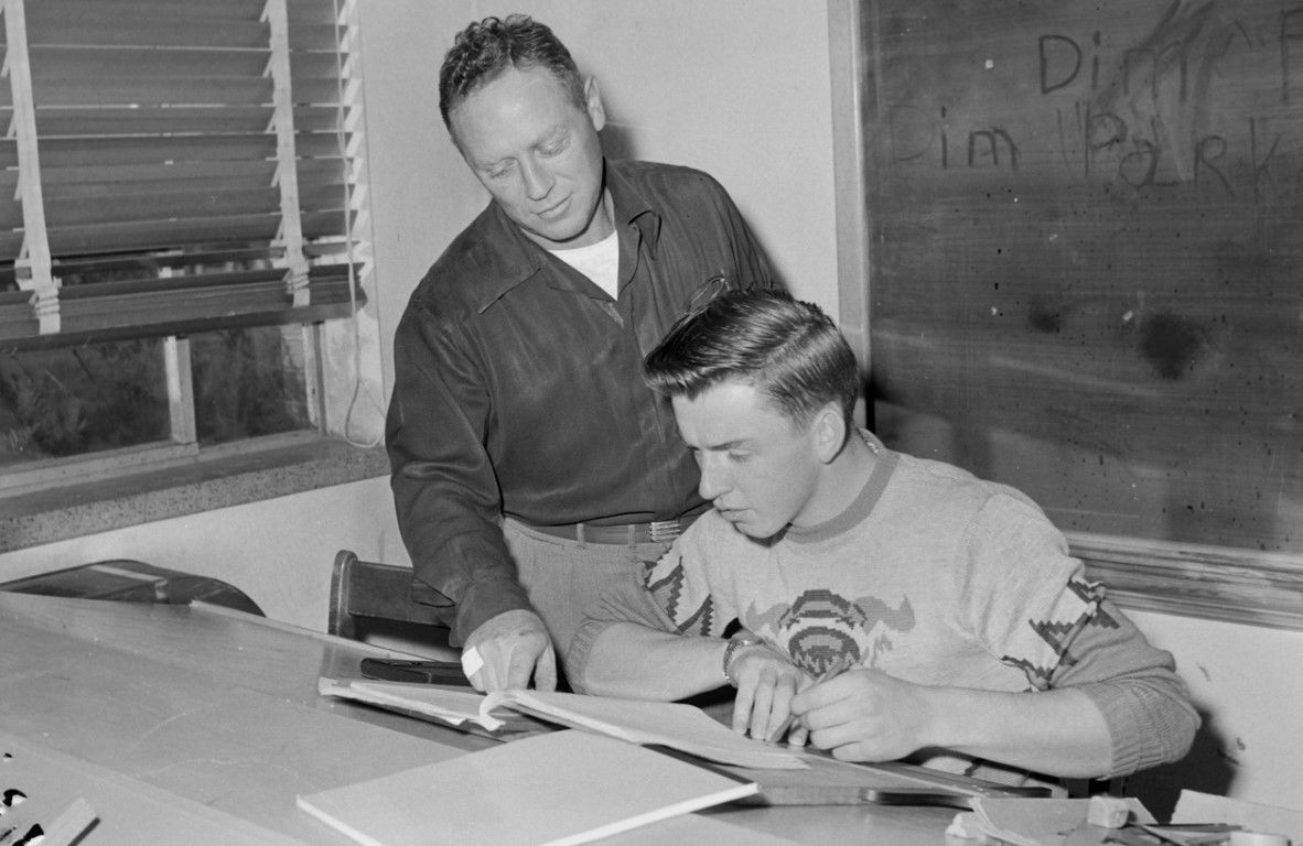 A student is seated at a desk while the teacher stands next to him pointing at something in a book.