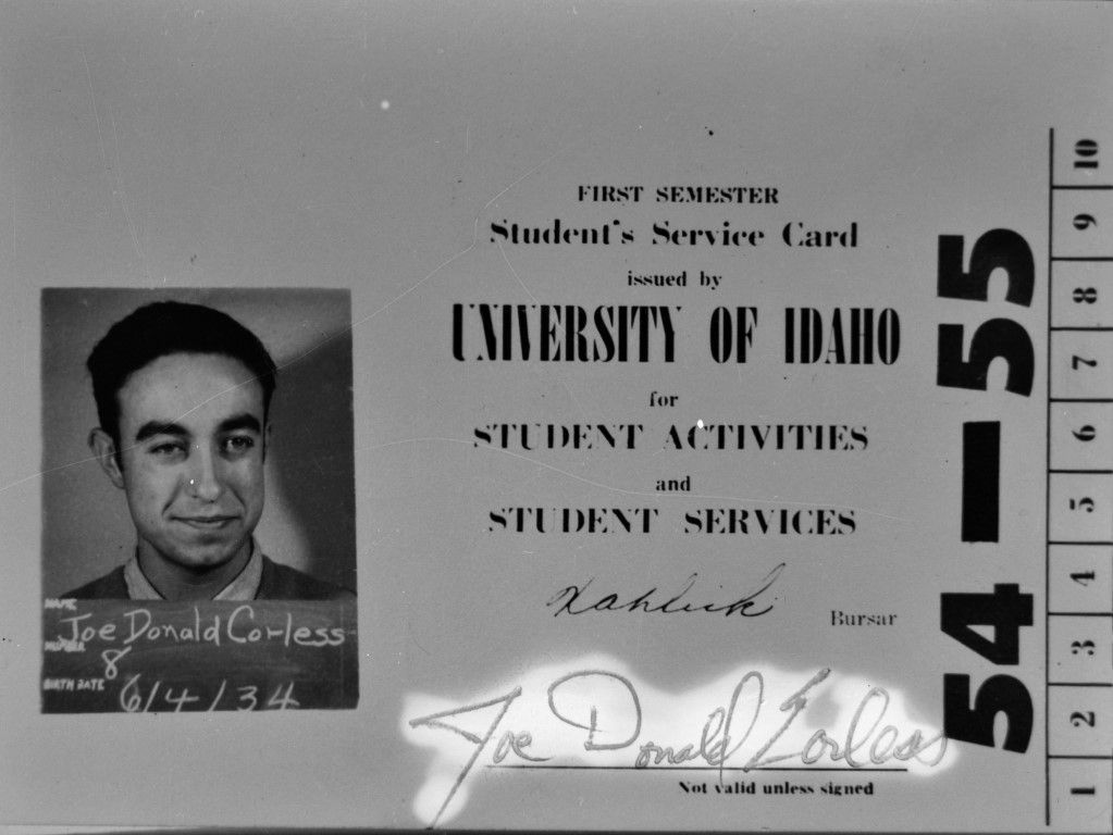 The University of Idaho Student's Service Card of Joe Donald Corless showing his picture and birthdate.