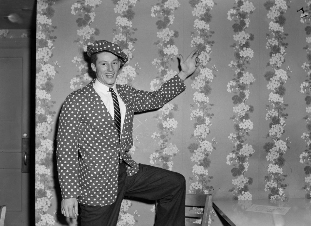 A young man in a polka dot suit and hat standing in front of a floral wallpapered wall.