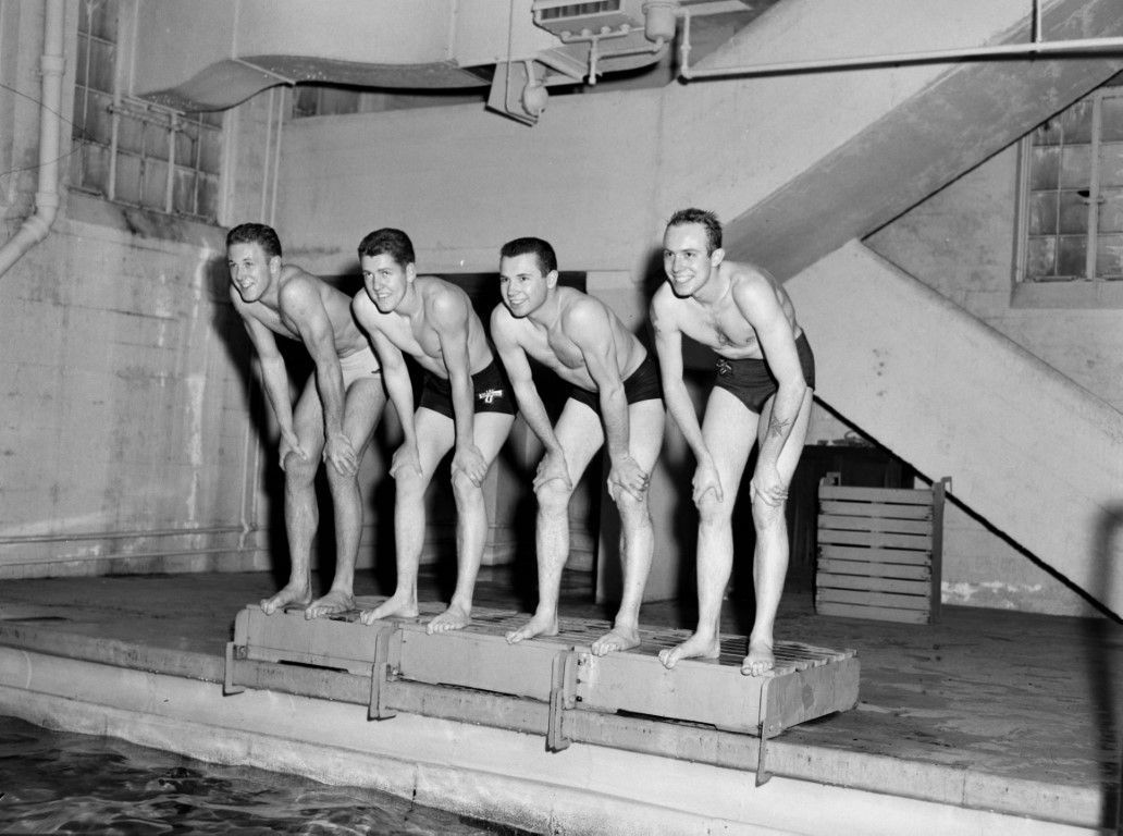 Four smiling swimmers are poised on a platform at the edge of a pool. U o I Memorial Gymnasium pool