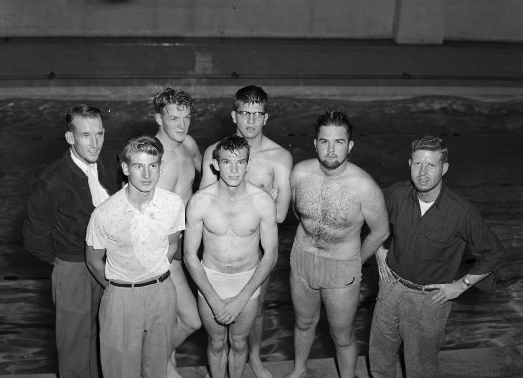 A group of young men standing in front of a pool. Some of the men are fully clothed and others are in swimming trunks.
