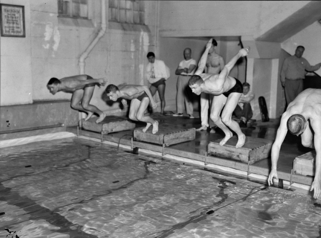 Four swimmers initiating their dives from the starting block at the beginning of a race.