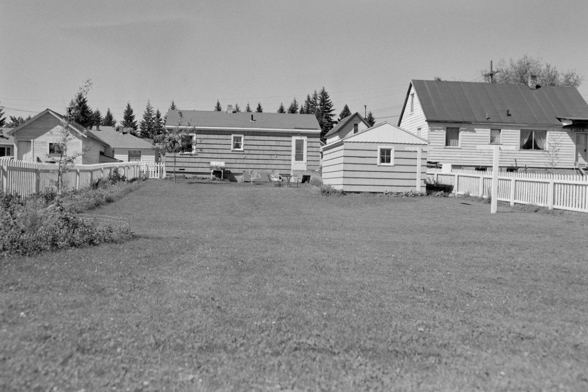 The back side and backyard of the house in 1189, patio table and chairs in the grass, heating oil barrel on a stand against the wall. A further away view than 1195 showing the shed, clothes line, landscaping and neighboring houses.