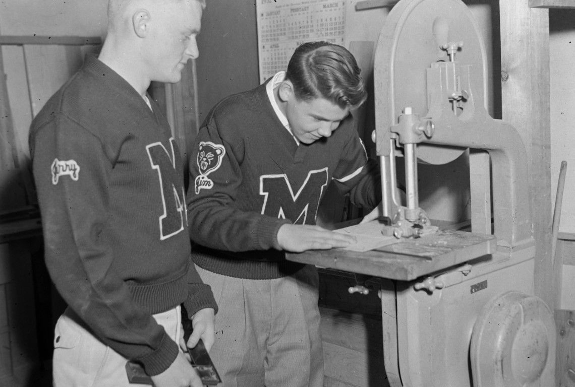 Two students in Wood Shop wearing Moscow High School sweaters are cutting wood on a bandsaw.