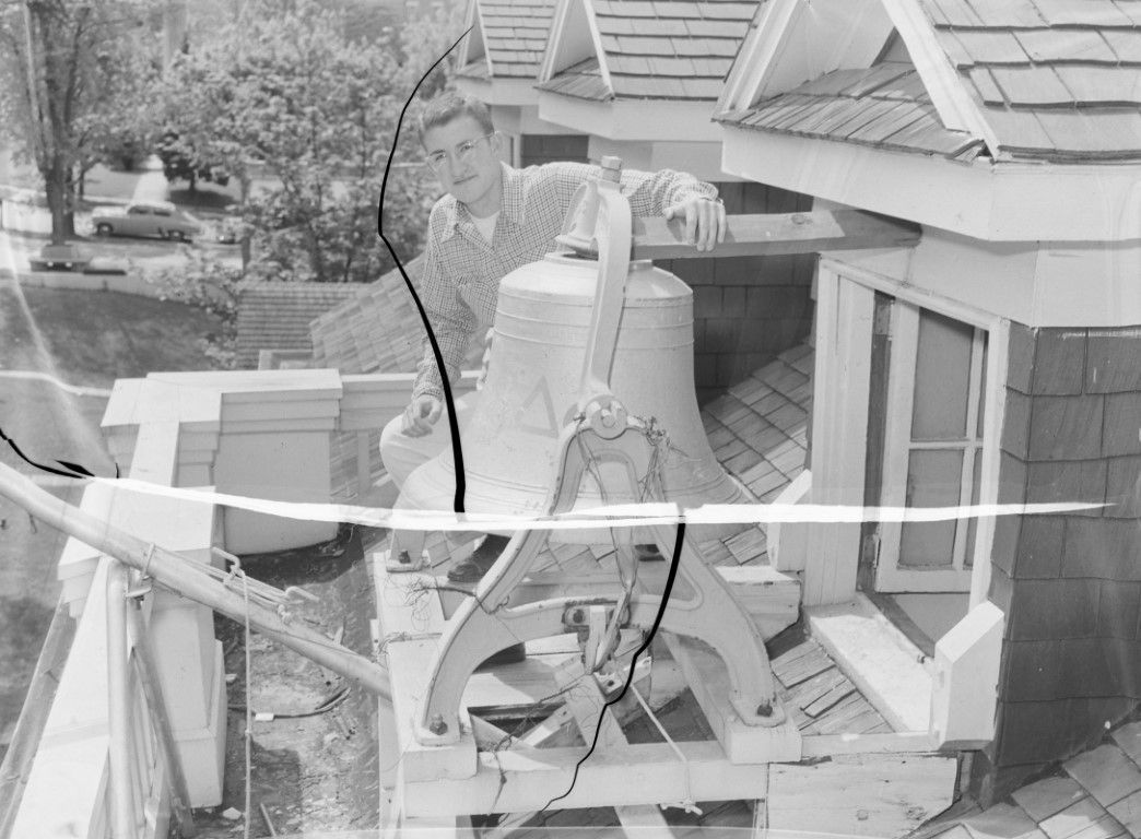 A man is posing with a large bell that has been mounted to the rooftop of a house.