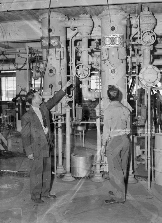 A man in a suit points to the gauges on the boiler as another man looks at them.
