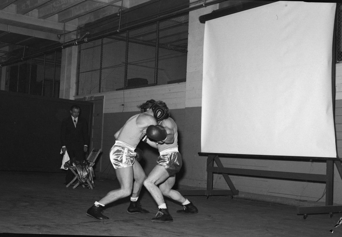 Two boxers "caught in a clench" while a man in the background looks on. U of i boxers sparring