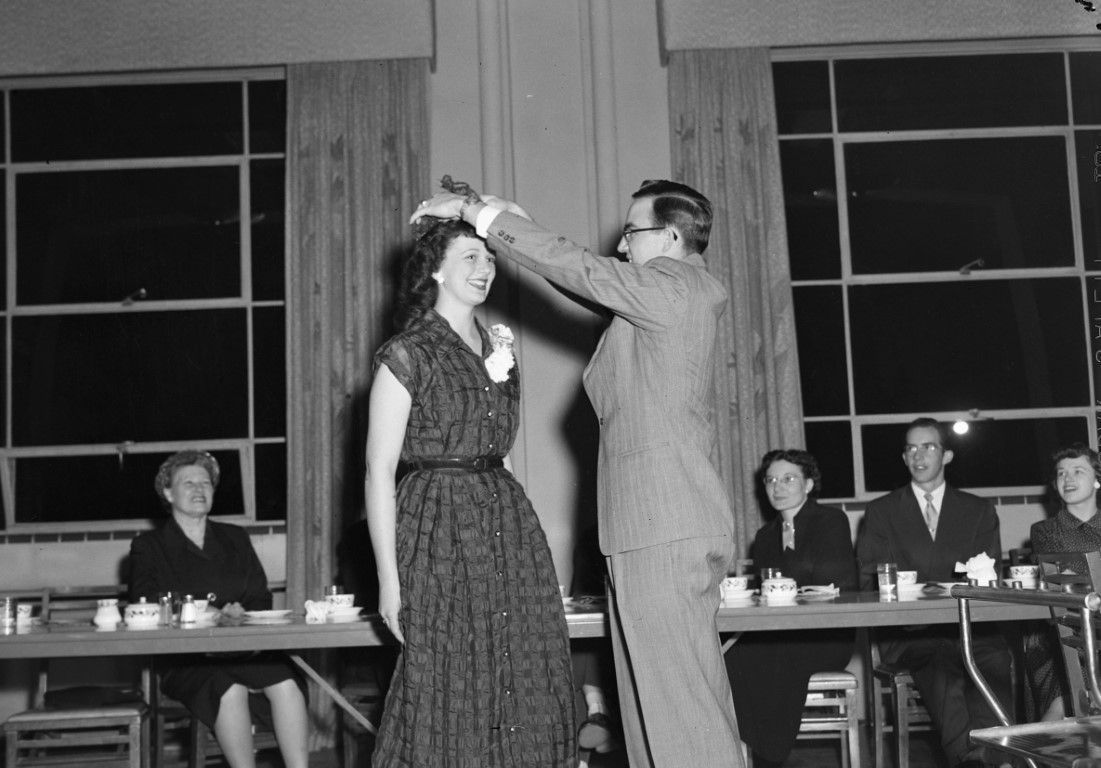 A young man is placing a crown on the head of a young woman in front of people seated at a banquet table.