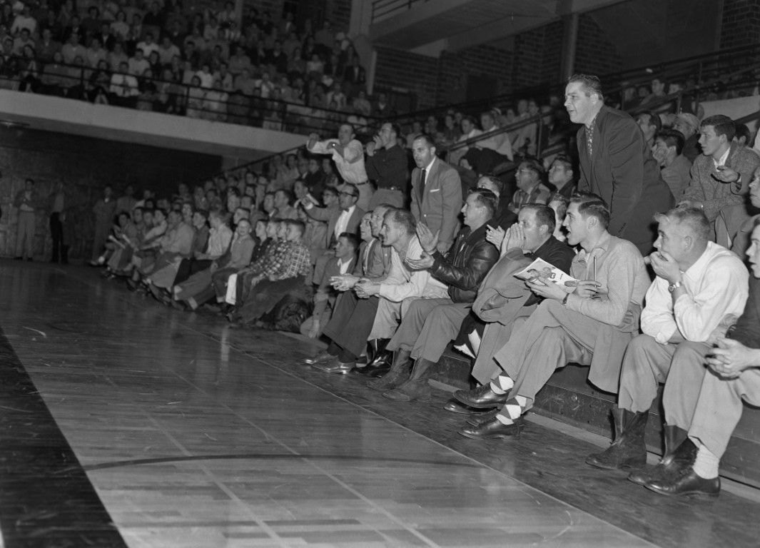 A group of spectators sitting in the bleachers watching a basketball game at the University of Idaho.