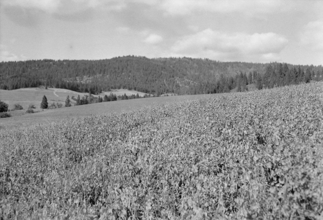 A field of peas, ridge covered in trees in the background