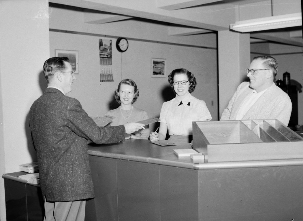 Two smiling women and a man are working behind a service counter while another man holding a cigarette is handing them an envelope.