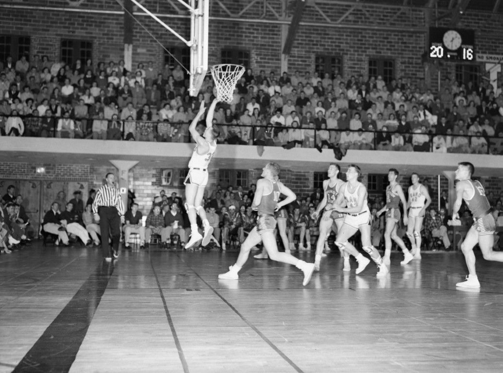 An Idaho basketball player is attempting a layup during a game against the Washington Huskies in front of a large crowd of spectators. The Vandals are leading 20 to 16.