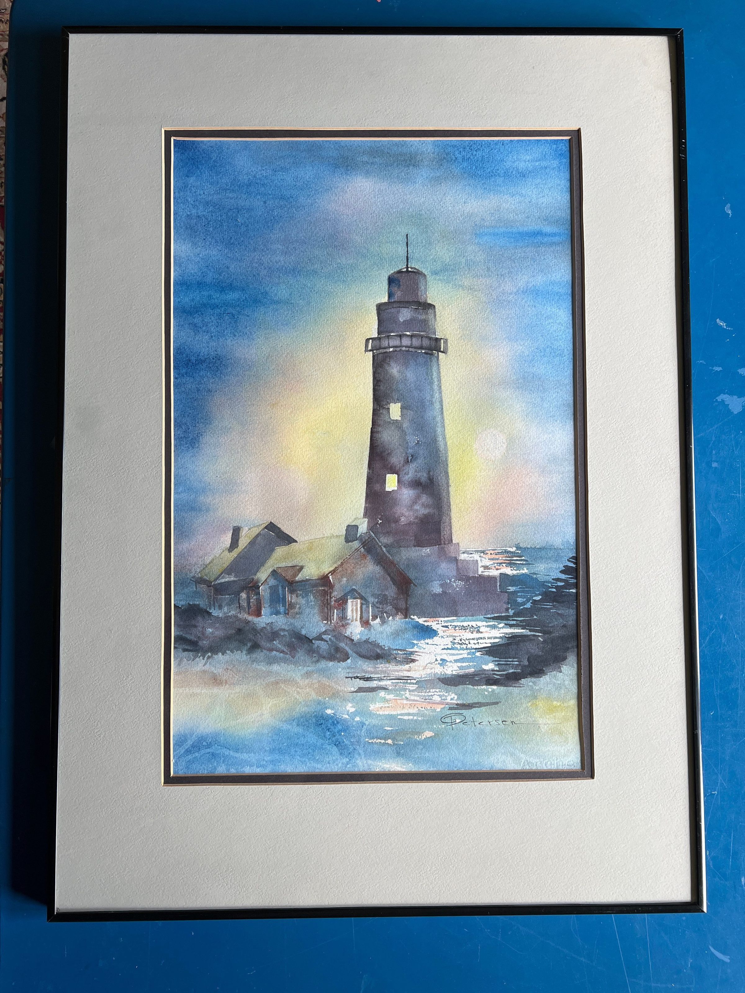Framed watercolor painting titled 'The Lighthouse' by Gertrude Peterson