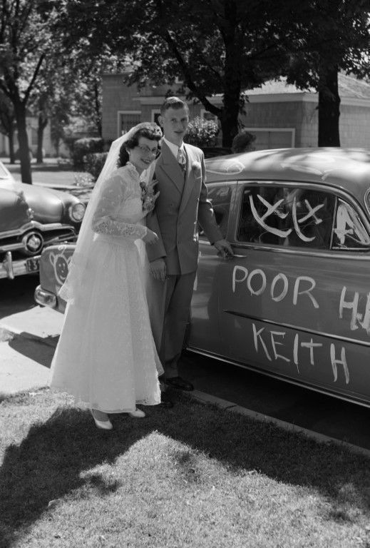 Rick Jones wedding: The bride and groom posing next to their car which has been decorated with writing and pictures. A car is parked behind theirs on the street, and a house is seen across the street.