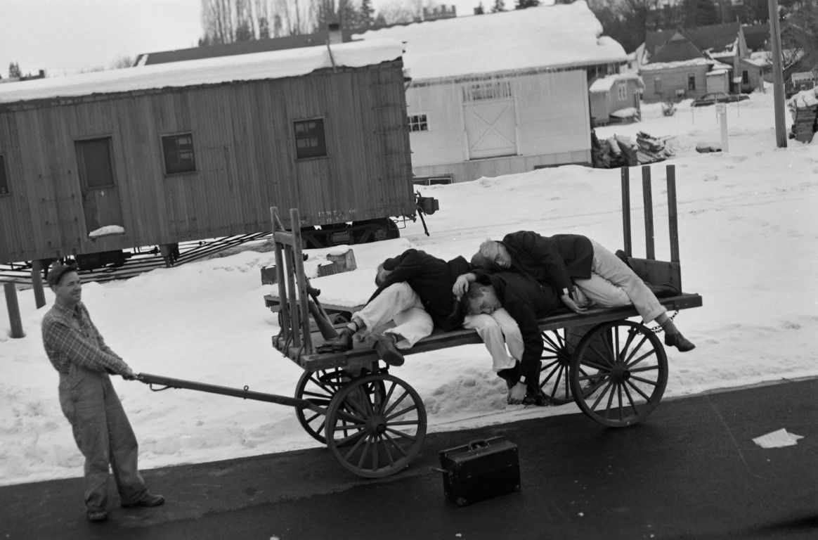 The mock train hijackers are playing dead while being hauled away on a cart.