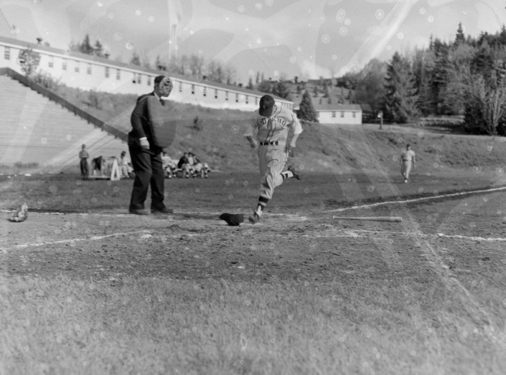 A University of Idaho baseball player touches home plate and scores a run with the umpire watching closely.