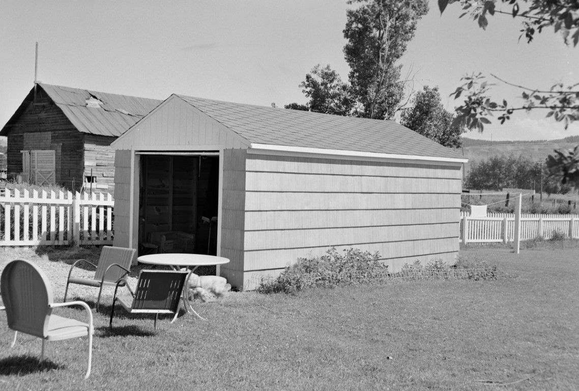 The shed and backyard of the house in 1189, patio table and chairs in the grass. Similar to 1191.
