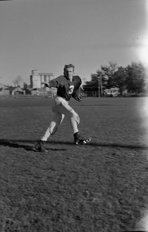 A football player in uniform with no helmet presents a stiff-arm while carrying the ball on the field.