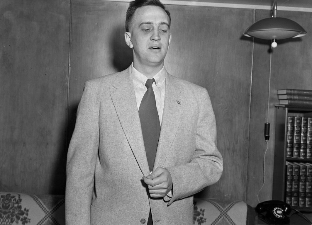 A young man in a light colored suit and dark tie standing in front of a sofa and bookshelf.