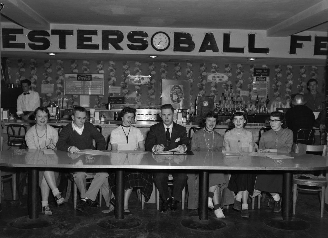 A group of young adults sitting at a long table in a restuarant or cafeteria. On the wall behind them reads "Foresters Ball."