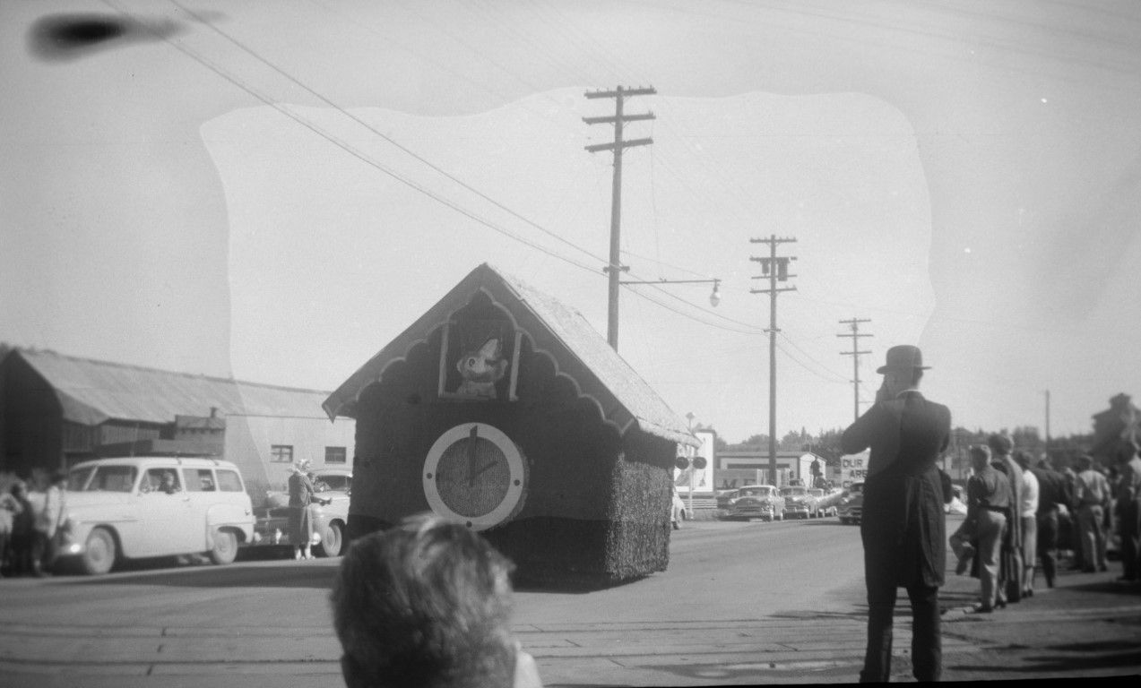 A parade float that resembles a cuckoo clock with an animal above the clock.