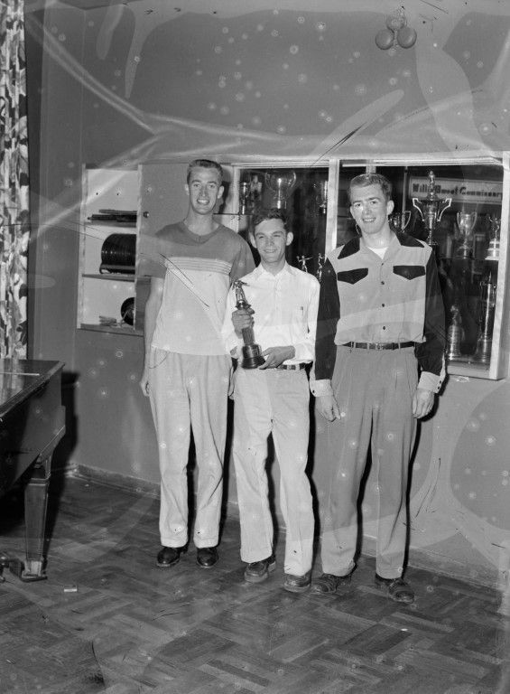 Three smiling young men - one holding a trophy - are posing for a picture in front of a trophy case.