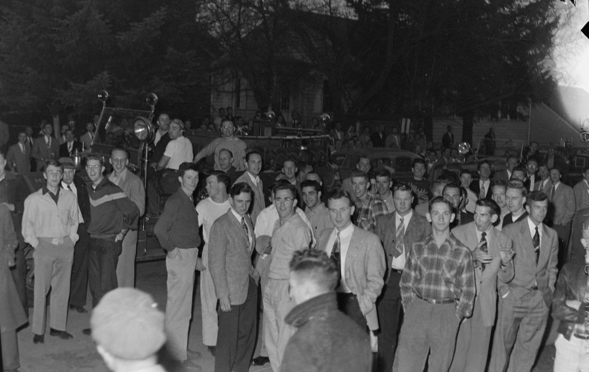 A very large group of young men, some dressed in suits, is gathered around a fire truck and some cars.