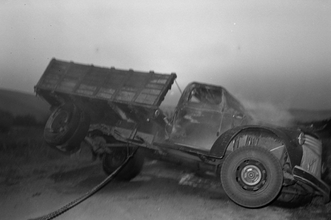 A smoking farm truck on the road is being turned upright.