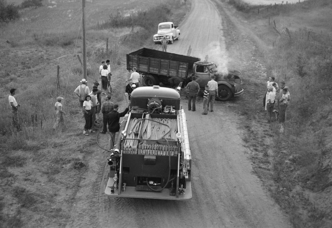 Moscow Fire Department extinguishing a farm truck fire on a gravel road while several spectators look-on.