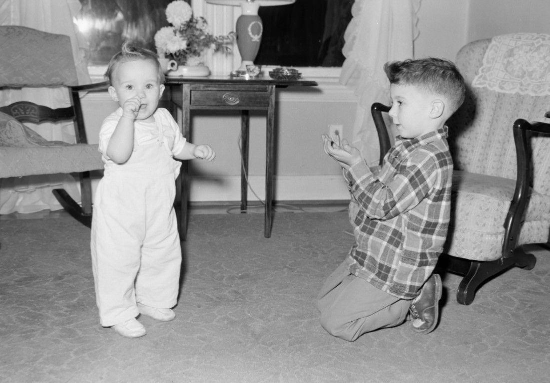 A toddler standing in a living room looking at the camera with a young boy kneeling beside them holding his hands out to the toddler