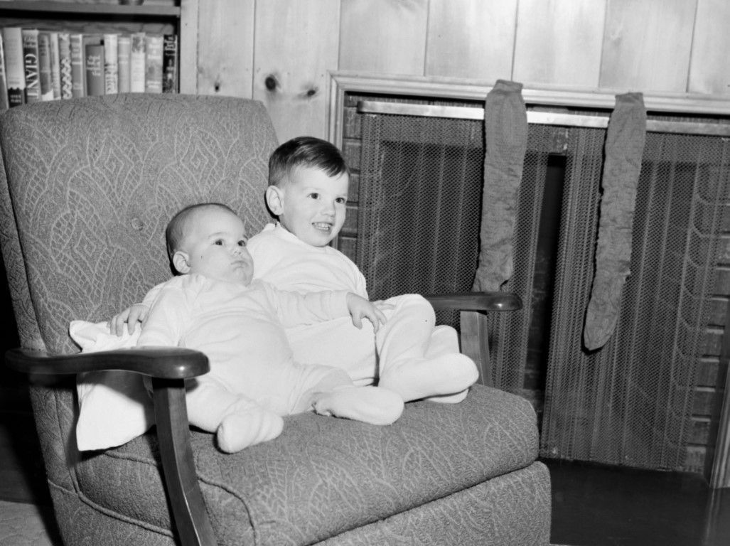 Two young boys sitting beside eachother in a chair in front of a fireplace. The fireplace has a pair of stockings hanging from the wire net.