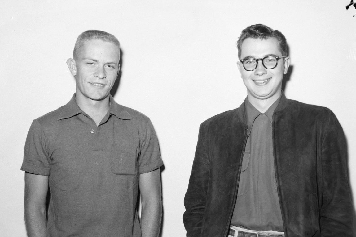 Two casually dressed young men are posing for a picture in front of a blank wall.