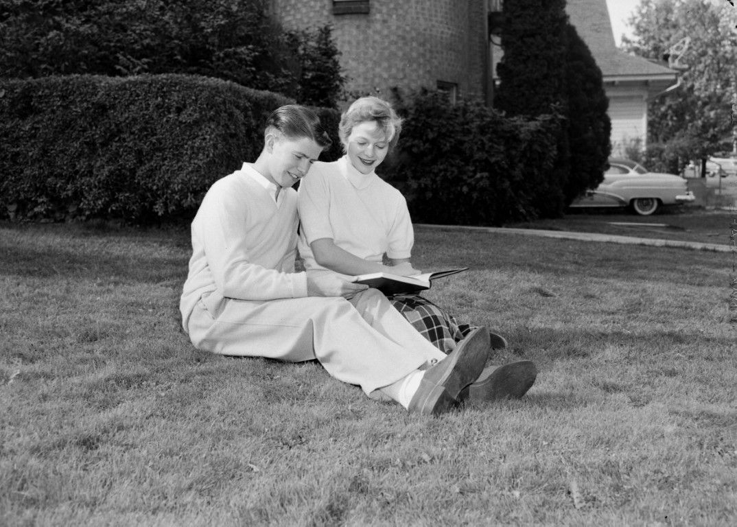A nicely dressed young man and woman are sitting on the lawn in front of a house reading. A car is parked in the driveway in the background.