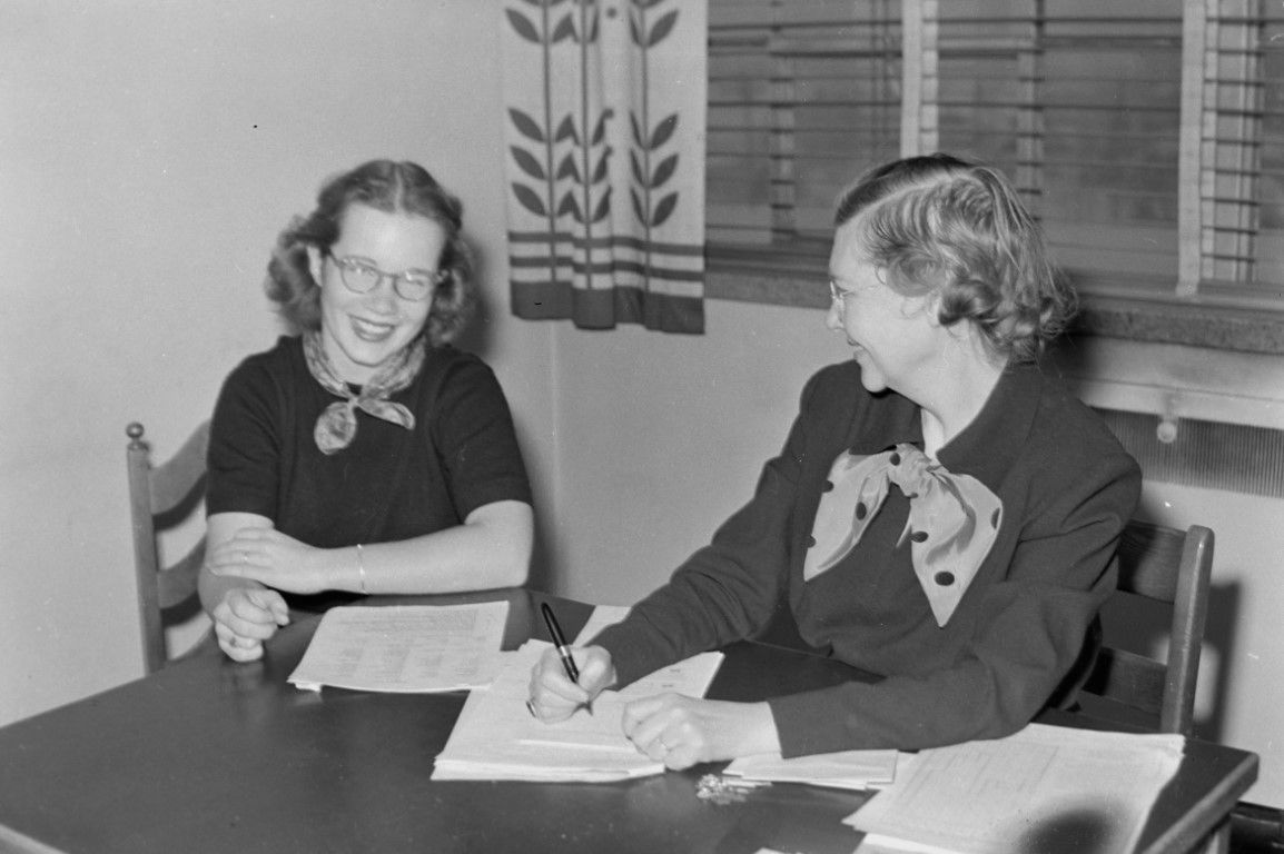 Two smiling women sitting at a desk and one of them is attending to paperwork.