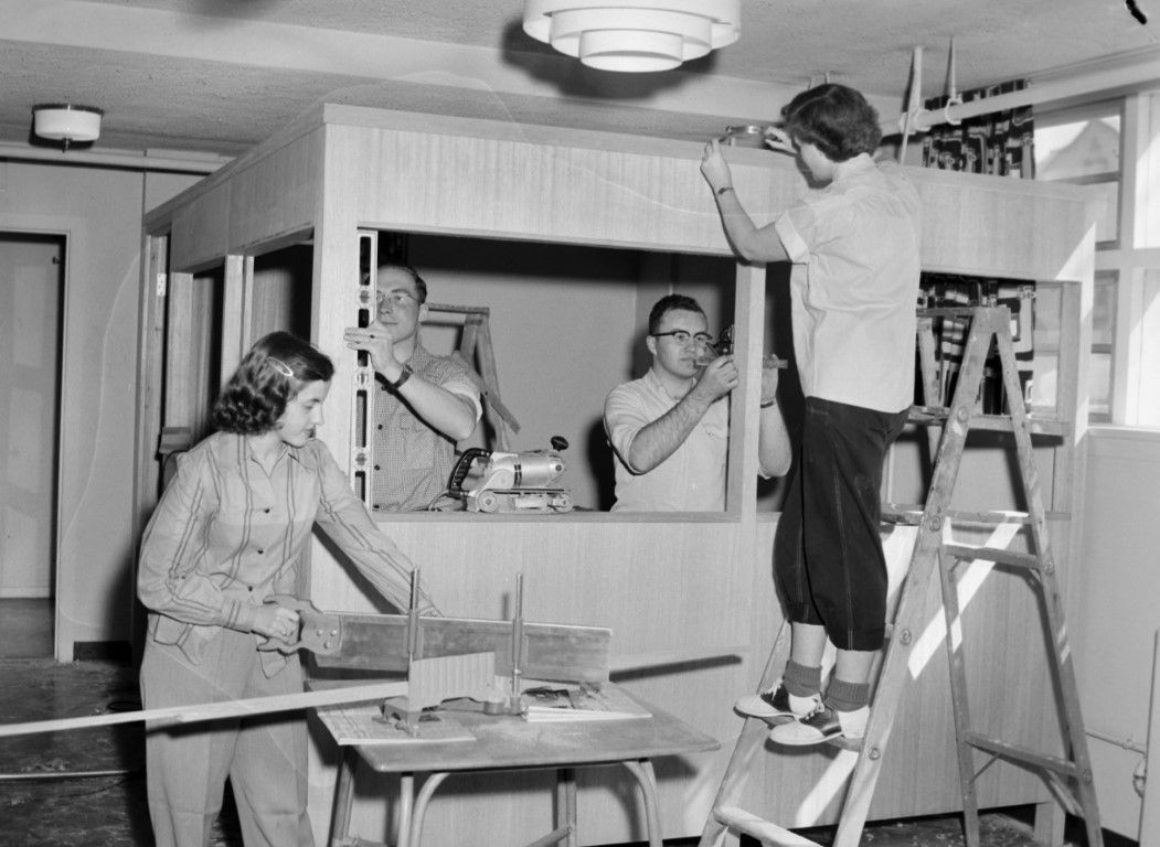 Two men and two women with various tools are building a booth-like structure inside of a room.