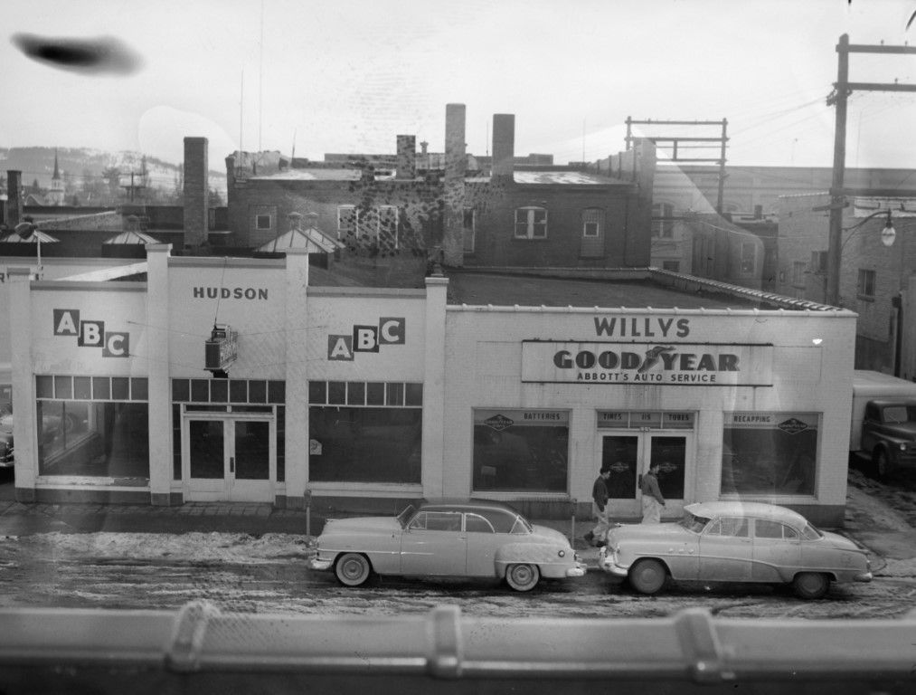 A view Abbott's Auto Service, Willys Goodyear, and the Auto Bjustrom Co. (Always Better Cars) used car dealership.