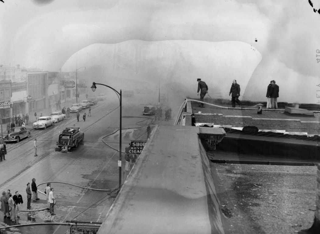 Men on the roof of Shorty's trying to extinguish a fire, while people gather on Main Street where cars and a fire engine are parked.