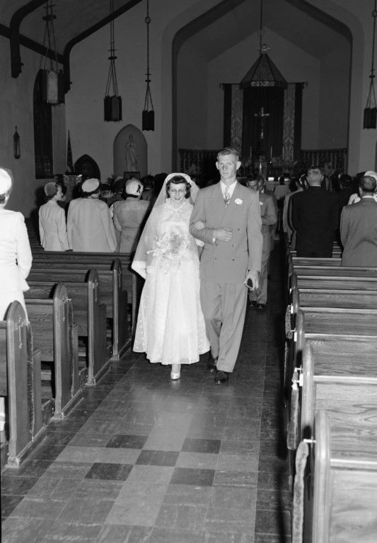 Rick Jones wedding: The bride and groom are leading the procession down the aisle of the church. Wedding guests are standing in pews at the front of the church.