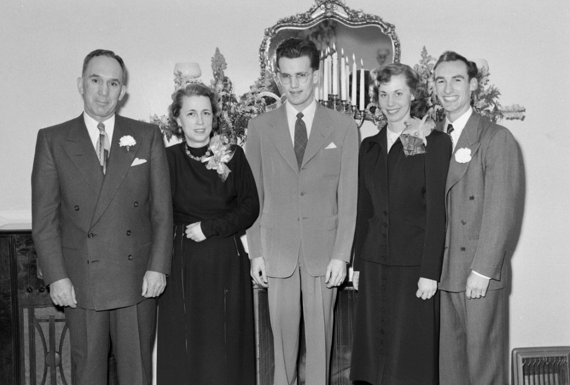 A newly wed couple, on the far right, standing with family members.