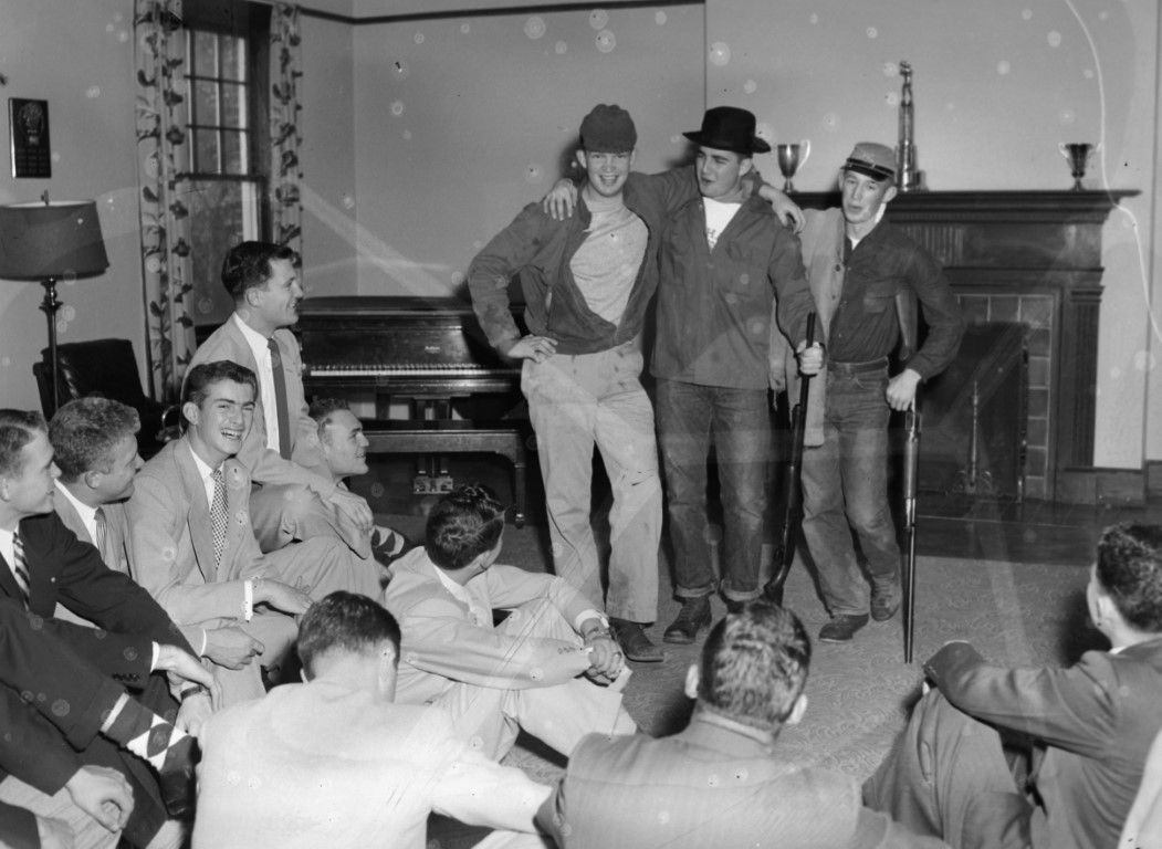 A group of young men in suits is gathered in a living room being entertained by three men wearing outdoor clothes and holding rifles.
