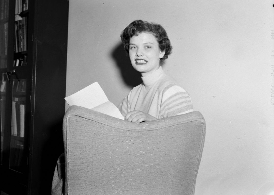 A woman sitting and holding a piece of paper and looking at the camera over the back of the chair.