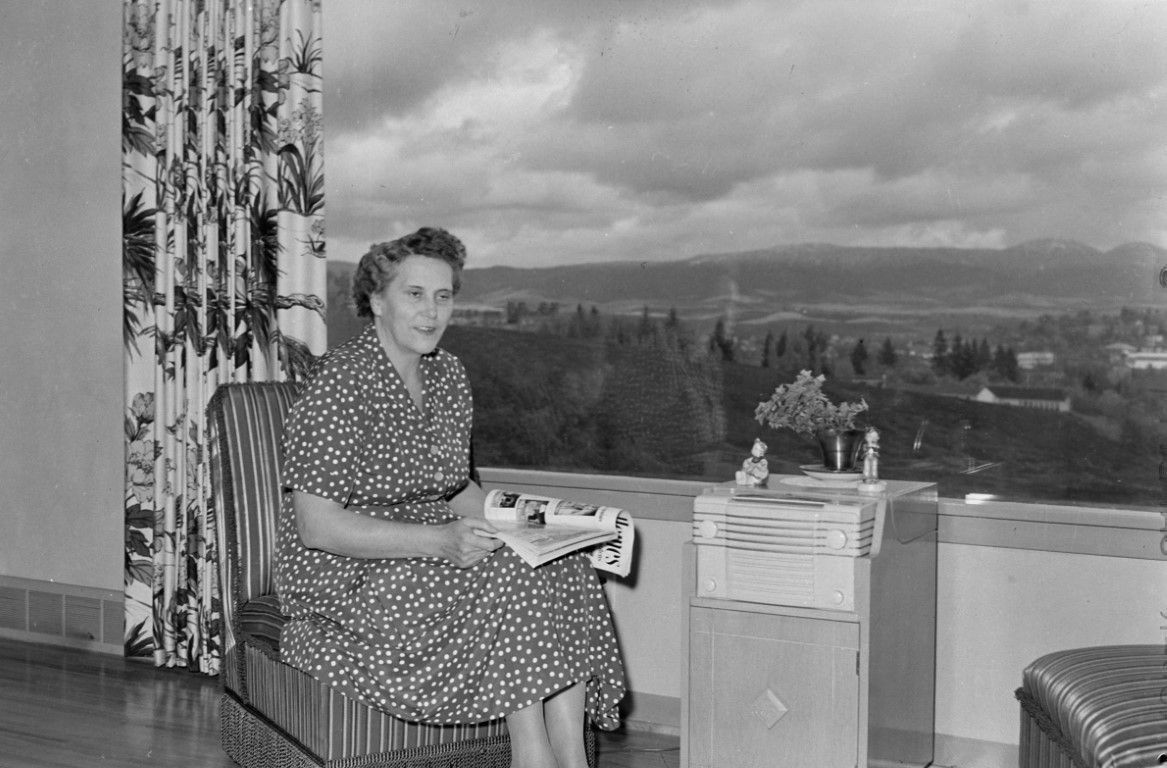 A woman in a chair, next to a radio, reading a magazine, by a window overlooking Moscow.