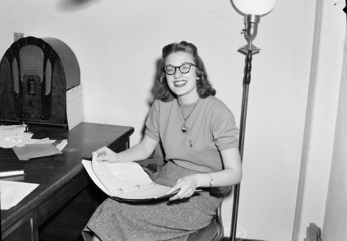A smiling woman is seated at a desk and holding a binder. A vintage radio is sitting on the desk beside her and a pole lamp is behind her chair.