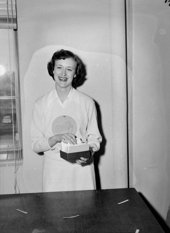 A smiling woman holding a box of index cards from the card catalog.