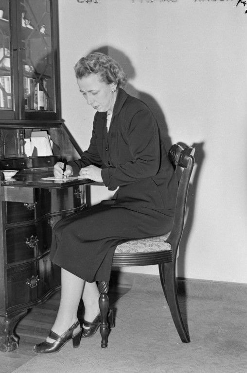 A woman sitting at a desk writing a letter.