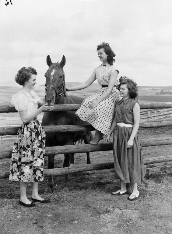 Three nicely dressed young women are posing with a horse at a split-rail fence.