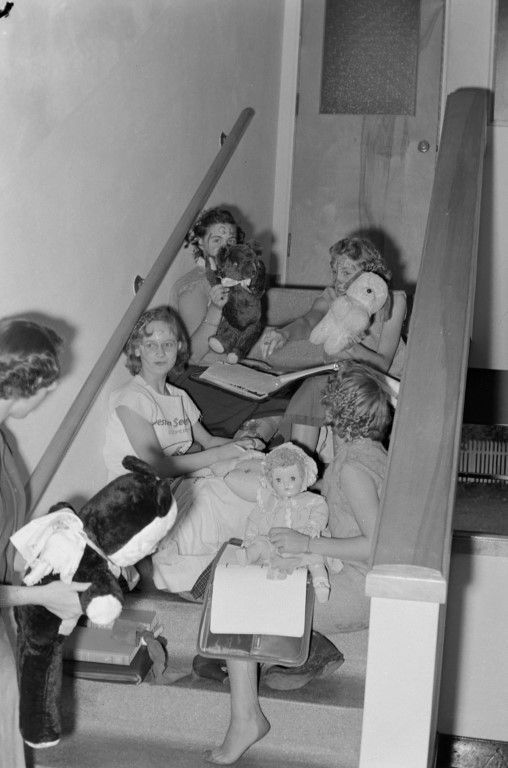 A small group of young women sitting on stairs and holding dolls and stuffed bears.