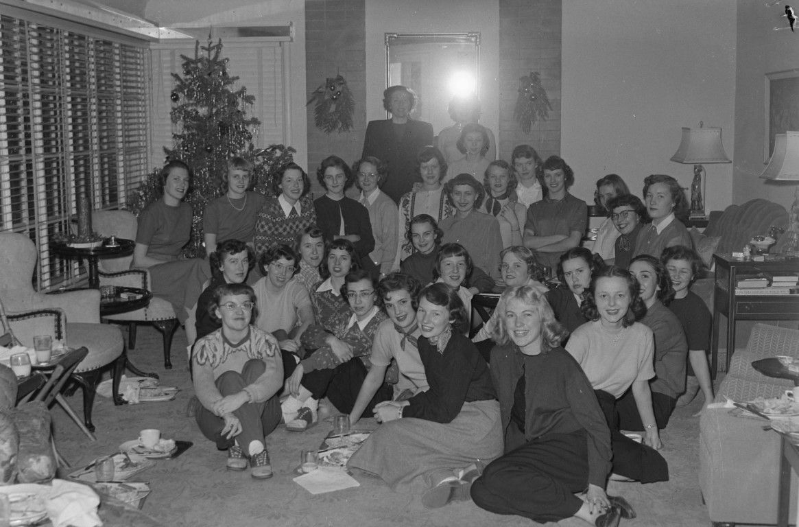 A large group of women sitting in a parlor or living room, a Christmas tree and decorations in the background (similar to 1225)